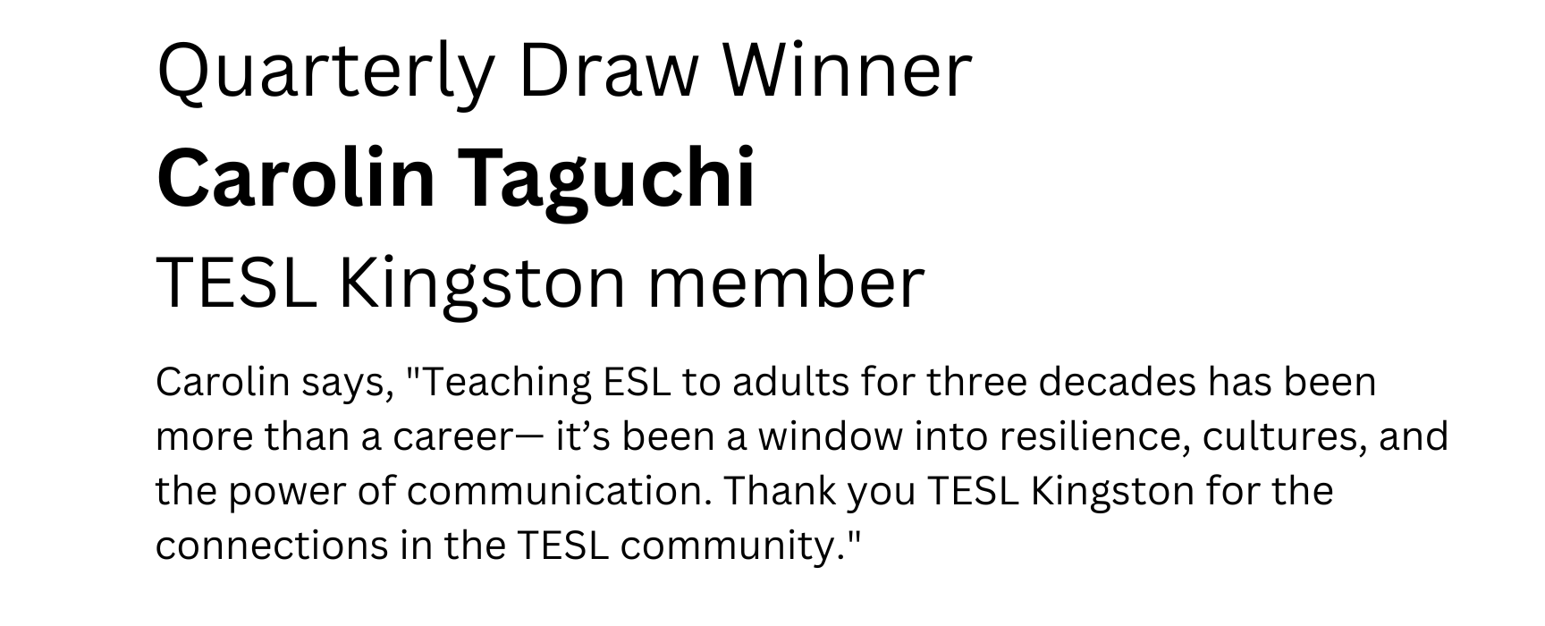 We have educators, newcomer settlement workers, tutors, volunteers, administrators, language assessors, teacher-candidates… Our Quarterly Draw celebrates what all our members do.